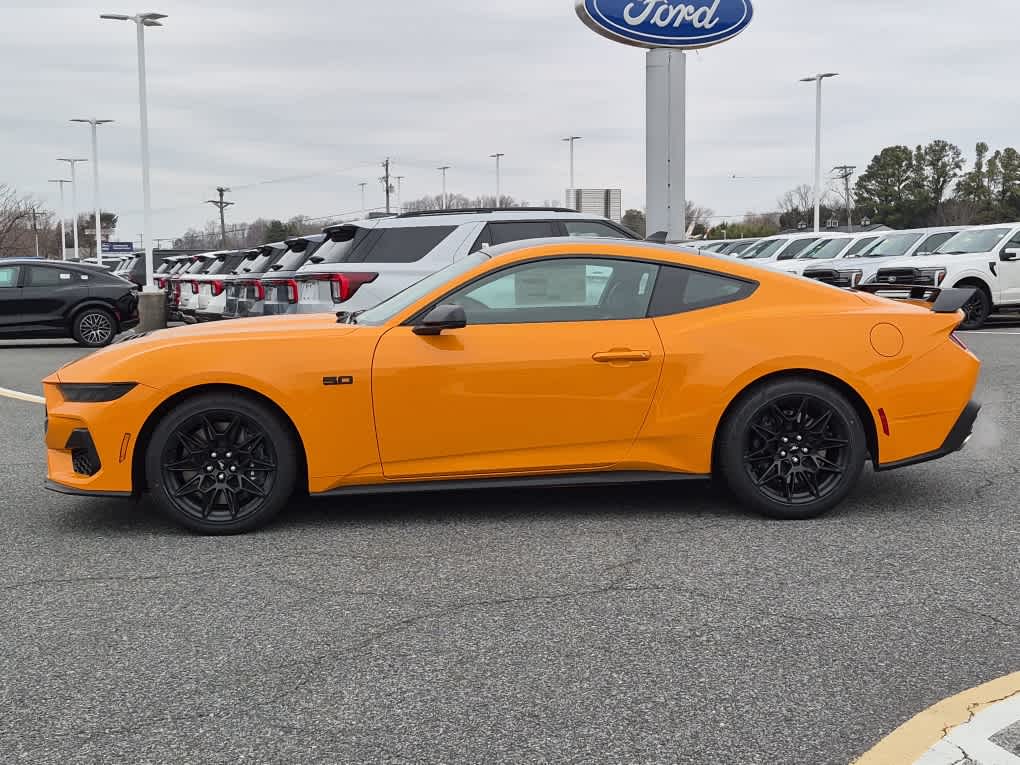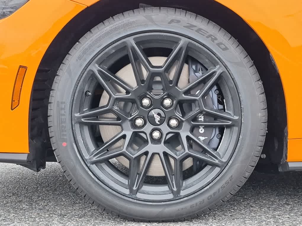 GT PERFORMANCE PACKAGE K-brace, Electric Hand-Operated Parking Brake (Drift Brake), Drift brake is intended for track use only, It should never be used on public roads, See Owners Manual for information on use, Heavy-Duty Front Springs, Black Painted Strut-Tower Brace, Front Towing Hooks, Painted High Gloss Black/Carbon Black Grille, Painted high gloss black upper/MIC carbon black lower grille, Unique Stability Control, EPAS and ABS tuning, Brembo Brake System w/Performance Linings, Red Painted Brake Calipers w/White Logo, Replaces included black w/white logo brake calipers when ordered w/GT Performance Package (67J), Upsized Rear Sway Bar, Accent Stitched Center Console Lid, Unique Chassis Tuning, EQUIPMENT GROUP 401A HIGH PACKAGE Premier Trim w/Color Accent Group, accent stitched center console lid and shifter boot, 5-piece leather-wrapped steering wheel w/chrome bezel and unique color-accented door-trim, Instrument Panel w/Accent Stitch, Perimeter Alarm, 3.55 Limited Slip Rear Axle, Ford Co-Pilot360 Assist+, Driver-assist features are supplemental and do not replace the drivers attention, judgment, and need to control the vehicle, It does not replace safe driving, See Owners Manual for details and limitations, Pre-Collision Assist w/Automatic Emergency Braking, One-Year Connected Navigation, Lane-Keeping System w/Lane Keeping Aid, Lane Keeping Alert, Driver Alert, road departure warning and Blind Spot Assist, Magnesium Framed Panoramic Curved Display, Driver Seat Memory w/3, MUSTANG NITE PONY PACKAGE Black Painted Wedge Decklid Spoiler, Black Mirror Caps, B&O SOUND SYSTEM BY BANG & OLUFSEN W/12 SPEAKERS subwoofer in trunk, ENGINE: 5.0L TI-VCT V8 stop/start system and Port Fueled Direct Injection (PFDI) (STD).
